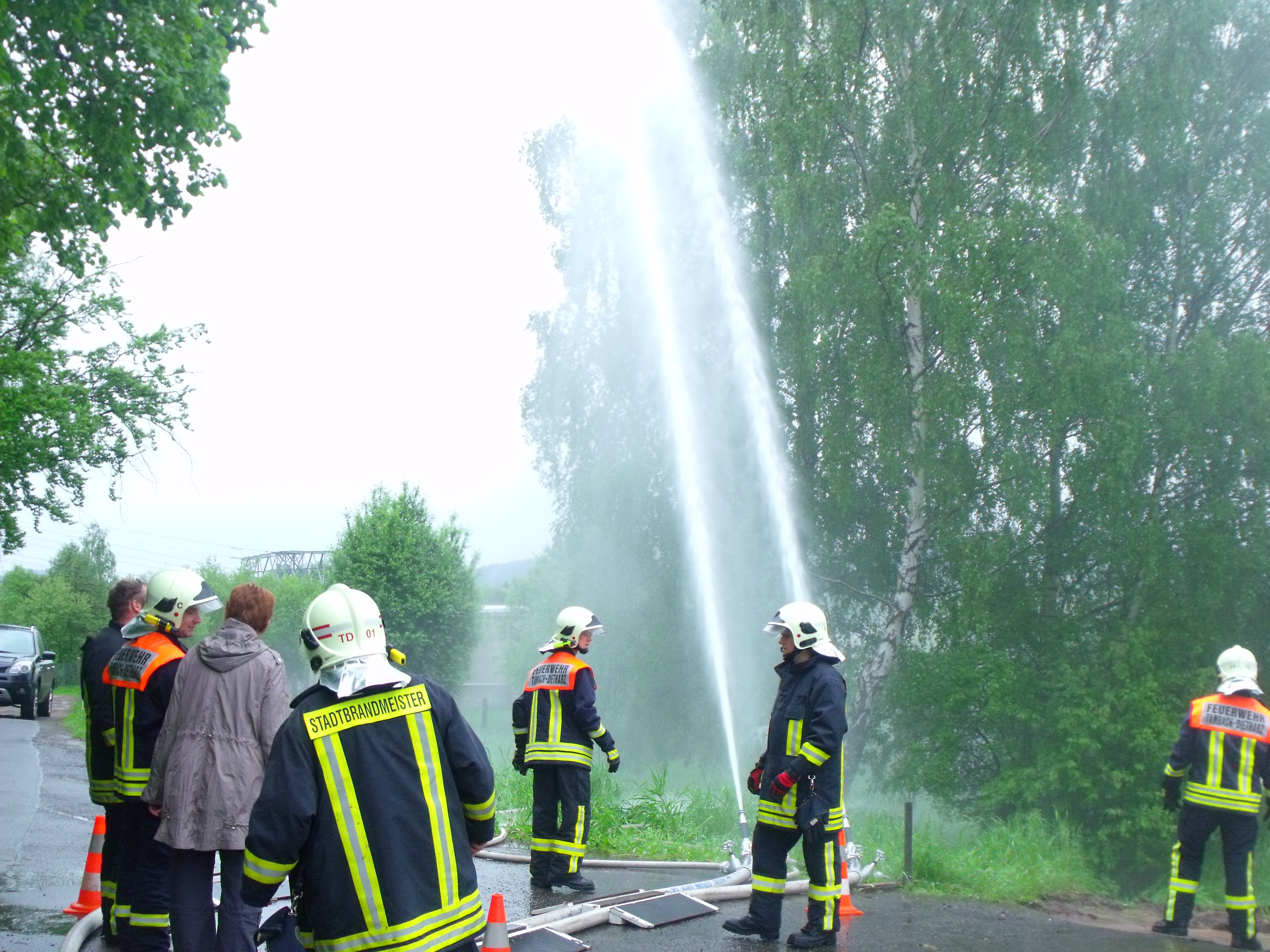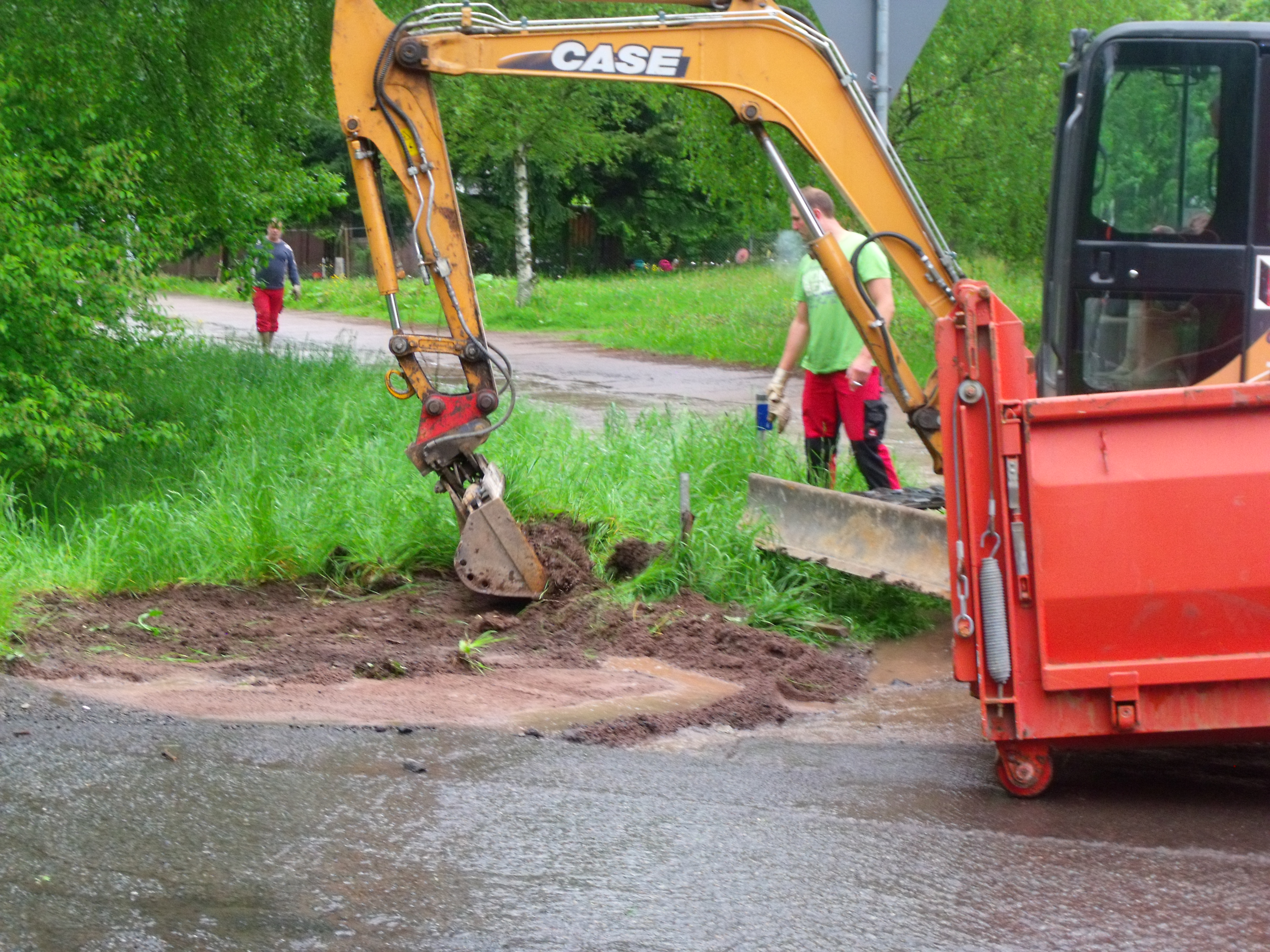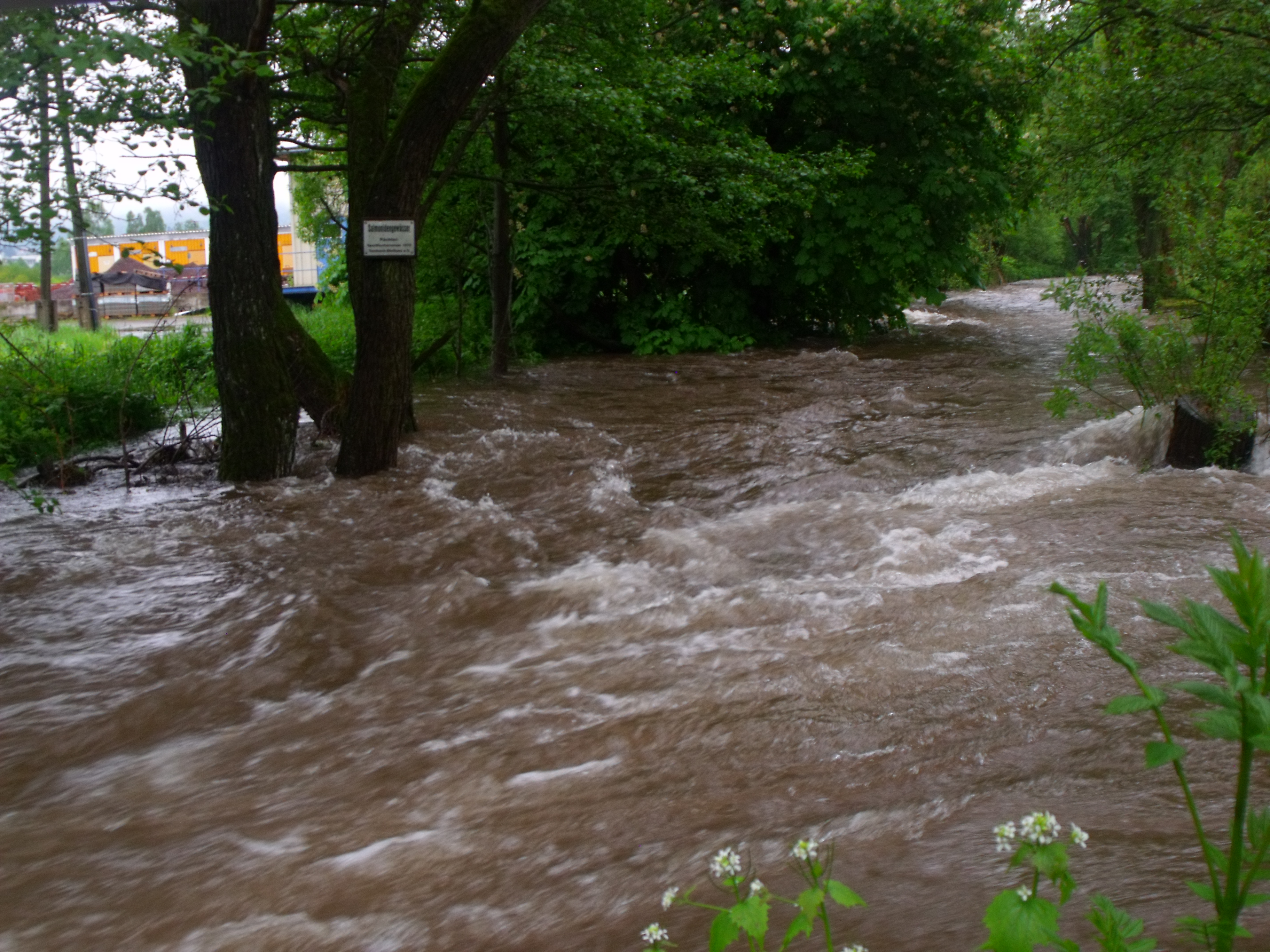 Während die umliegenden Feuerwehren wegen des anhaltenden Regens viele Einsätze fahren, sind wir BIS JETZT relativ gut davon gekommen. Heute wurden wir wegen einer überfluteten Straße gerufen. Das Wasser floss dann bei der EON in einen Keller. Ein angefortetes Bauteam baggerte die Böschung frei und wir legten eine Mauer aus Sandsäcken. Somit war der Auftrag erledigt.