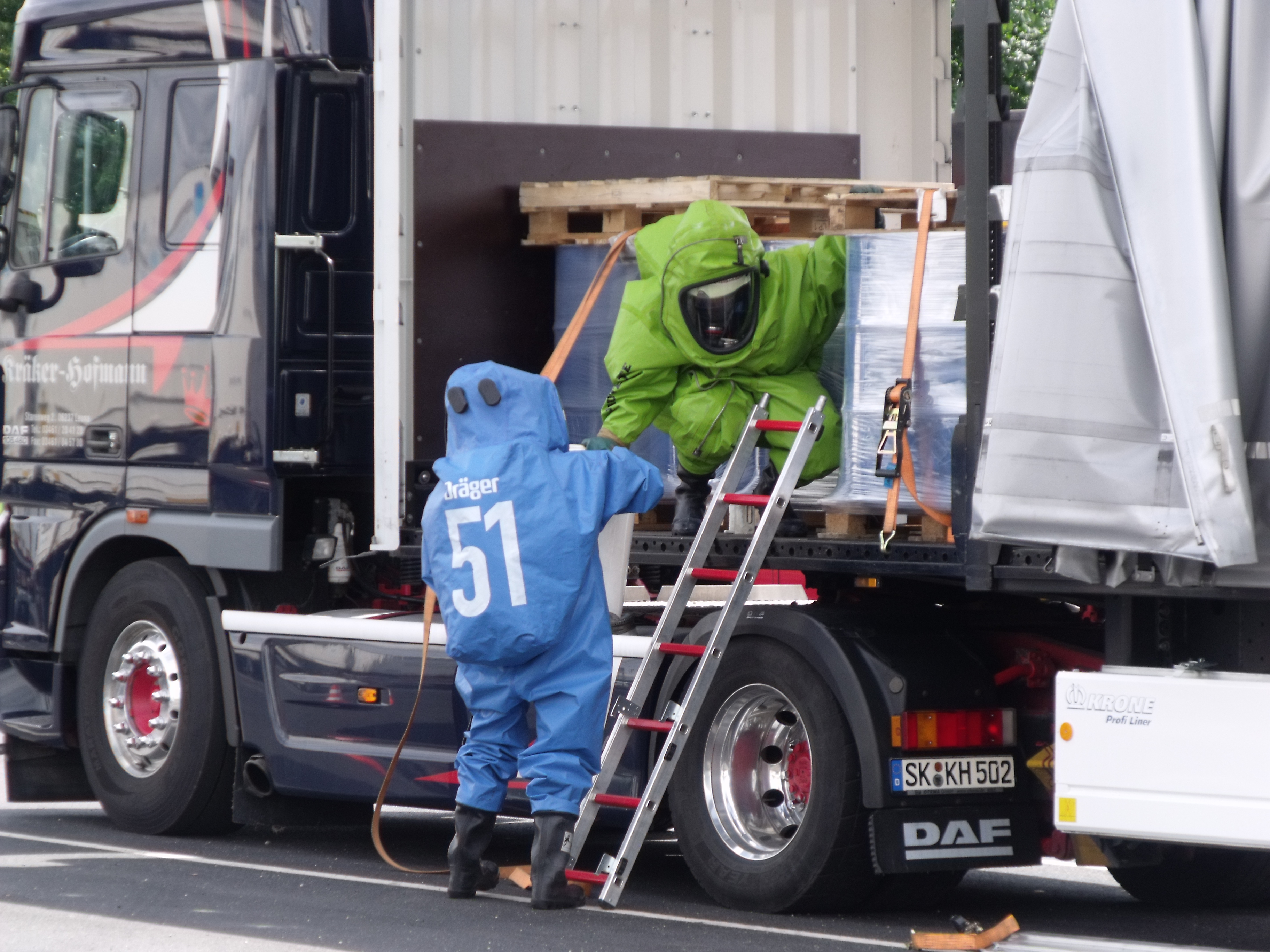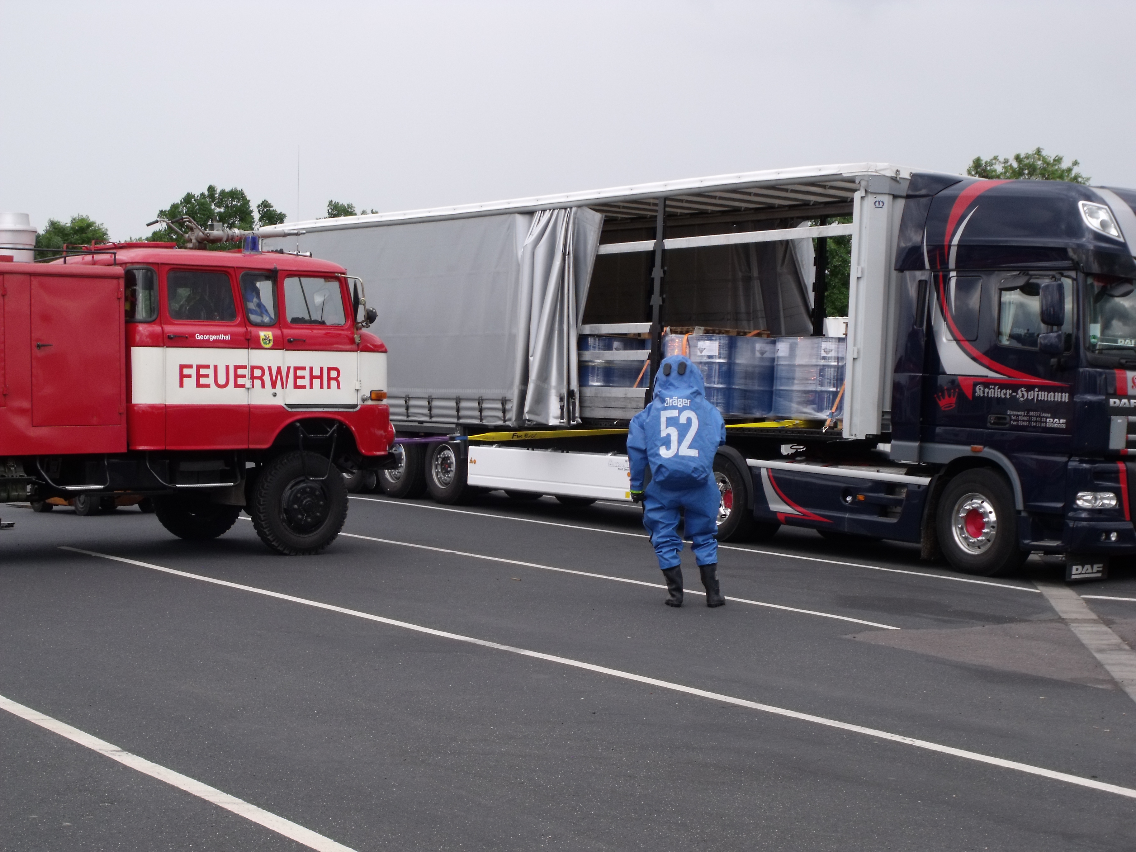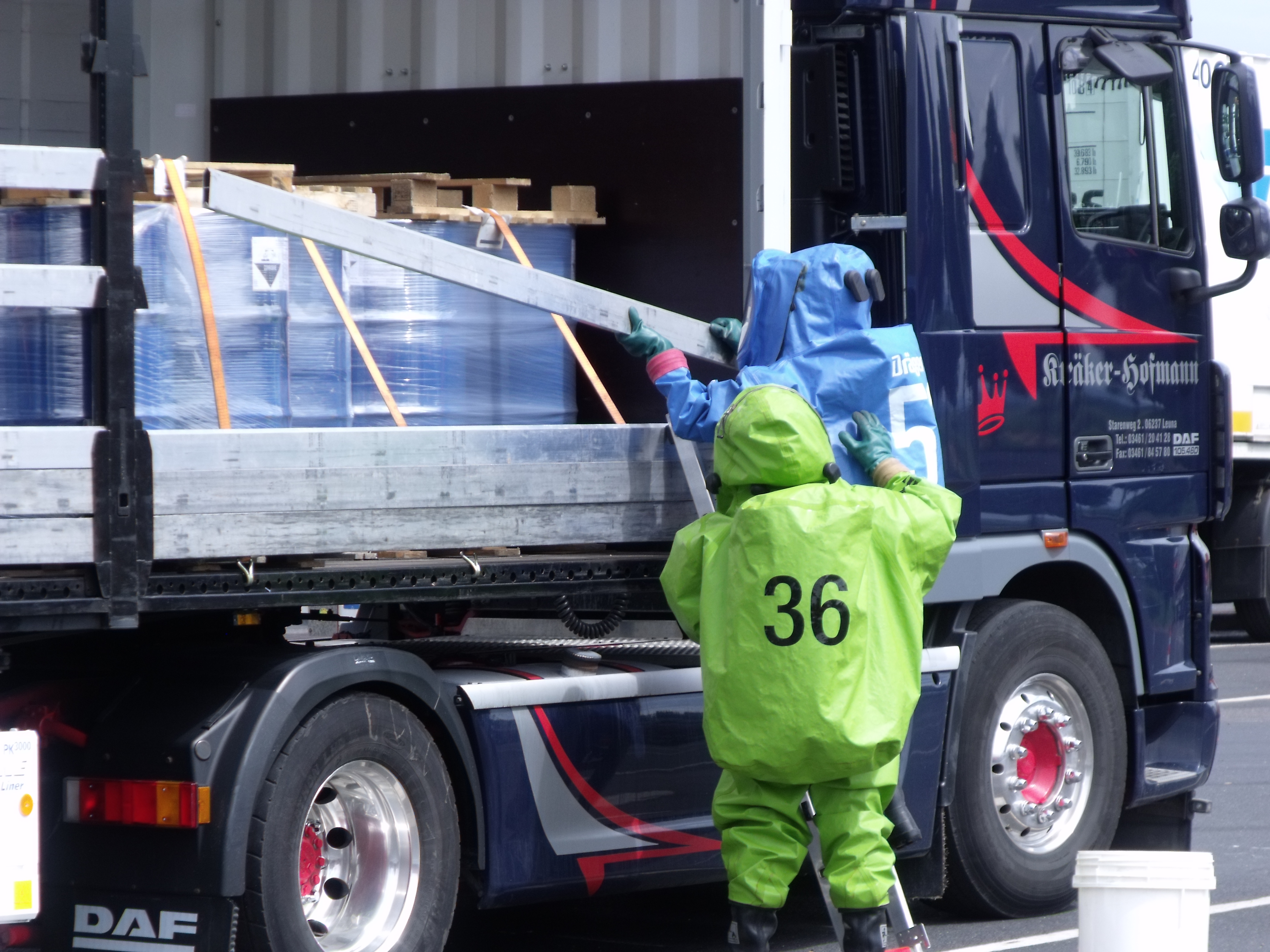 Heute wurde der Gefahrgutzug vom Landkreis Gotha auf den Autohof in Schwabhausen gerufen. Bei einer Ladungskontrolle bemerkten die Beamten der Gothaer Polizei zwei undichte Fässer auf einem Sattelschlepper aus Leuna. Es handelte sich dabei um Zinntetrachlorid. Der Stoff ist ätzend, sauer und anorganisch. Schon bei einer Temperatur von 20°C verdampft die Flüssigkeit rasch und erreicht schnell eine toxische Konzentration in der Luft und kann ein toxisches Lungenödem auslösen. Wie typisch für ein toxisches Lungenödem kann die Symptomatik erst nach einigen Stunden bis drei (!) Tagen auftreten. Ca. 60 Kameraden aus Waltershausen, Gotha-Mitte, BF Gotha, Georgenthal, Emleben, Tambach-Dietharz, Neudietendorf, Ohrdruf, Warza, Gräfentonna, Wechmar, Wahlwinkel, Gräfenhain waren im Einsatz. Zwei Kameraden von Tambach gingen unter schwerem CSA zur Erkundung vor. Zwei Kameraden aus Gotha Mitte haben dann die betroffene Palette geborgen. Und zwei Feuerwehrleute aus Neudietendorf nahmen dann eine Probe.