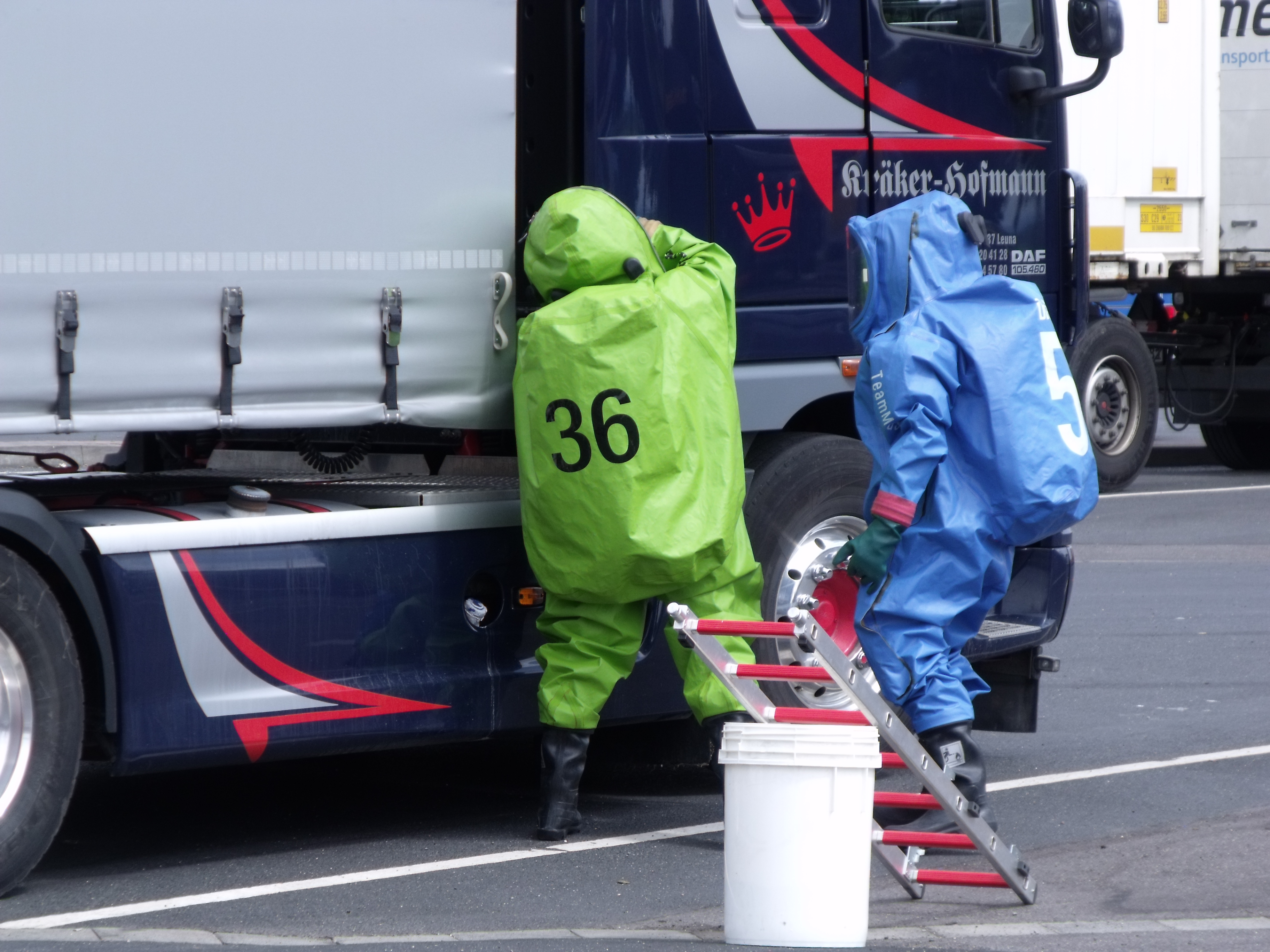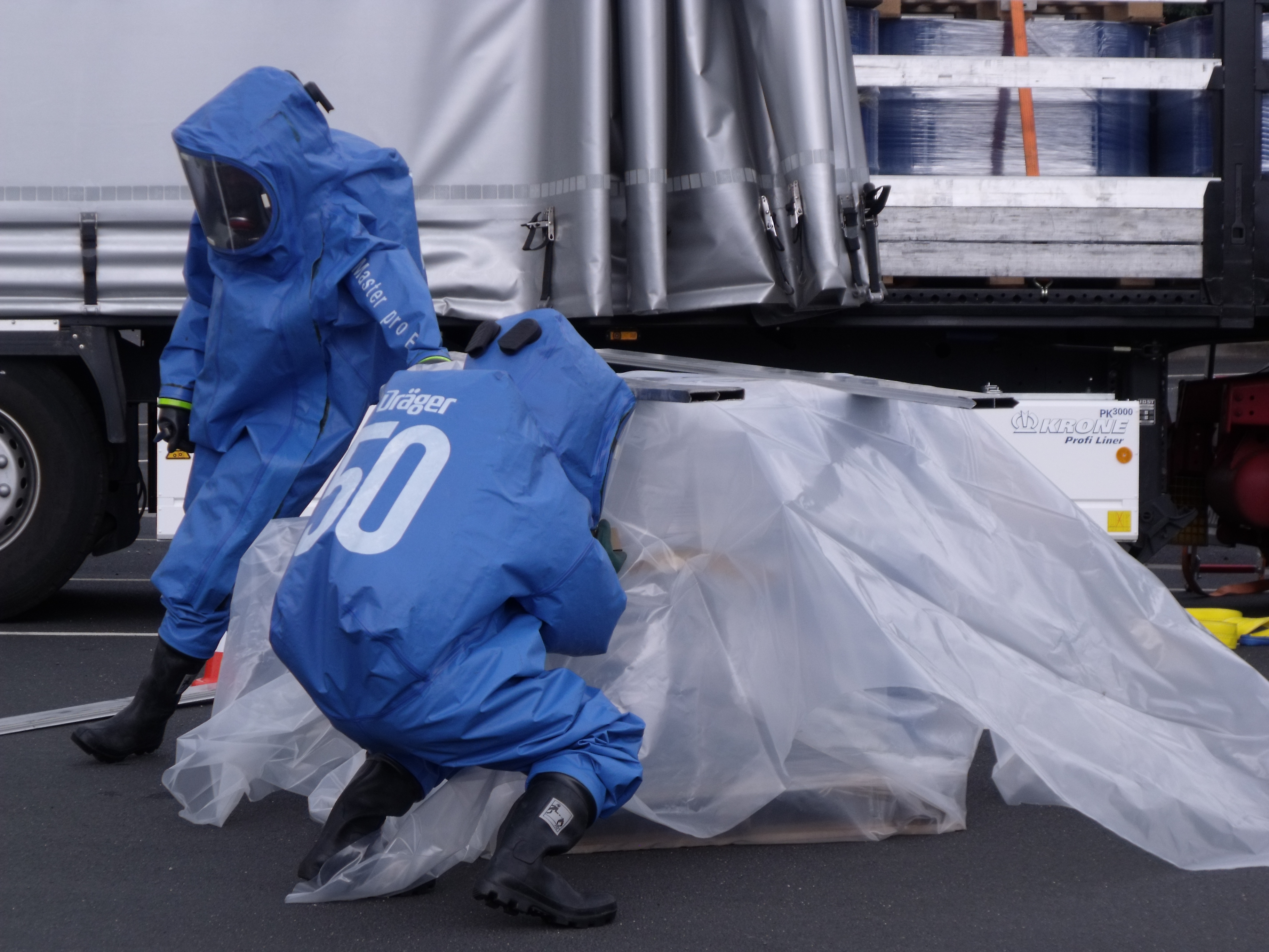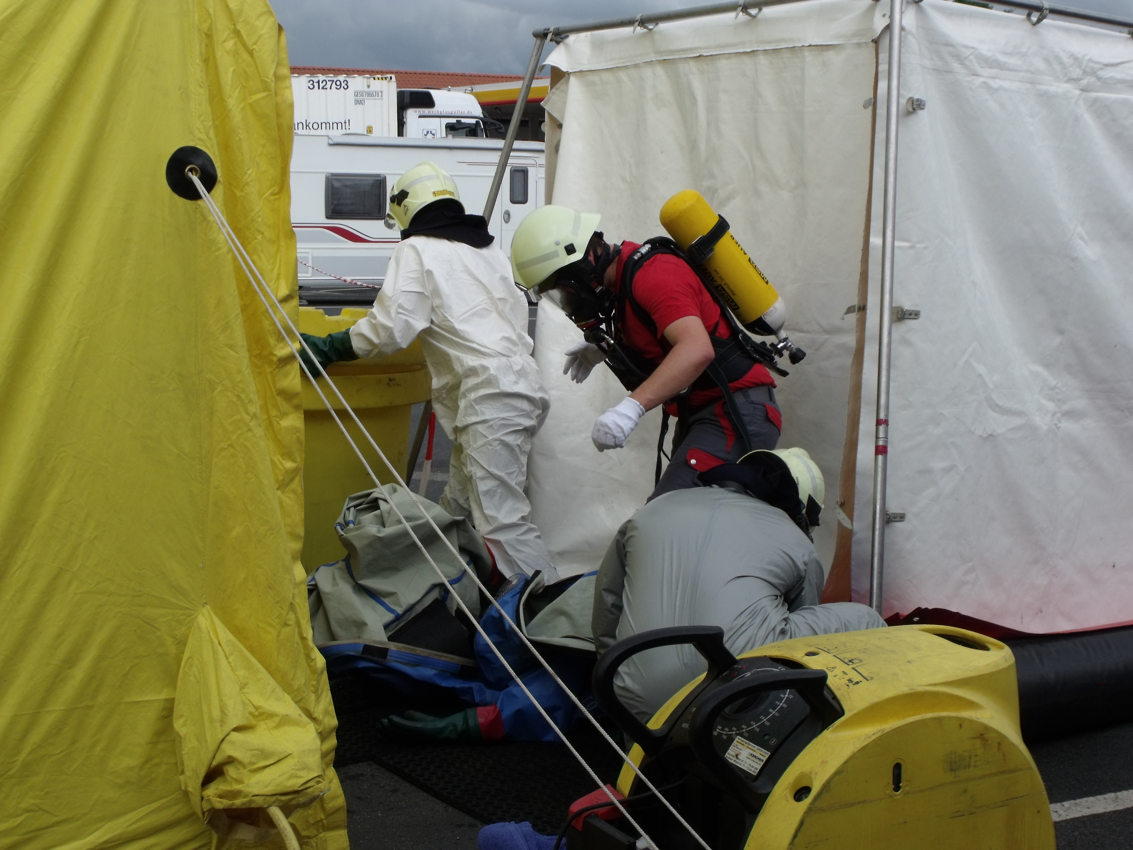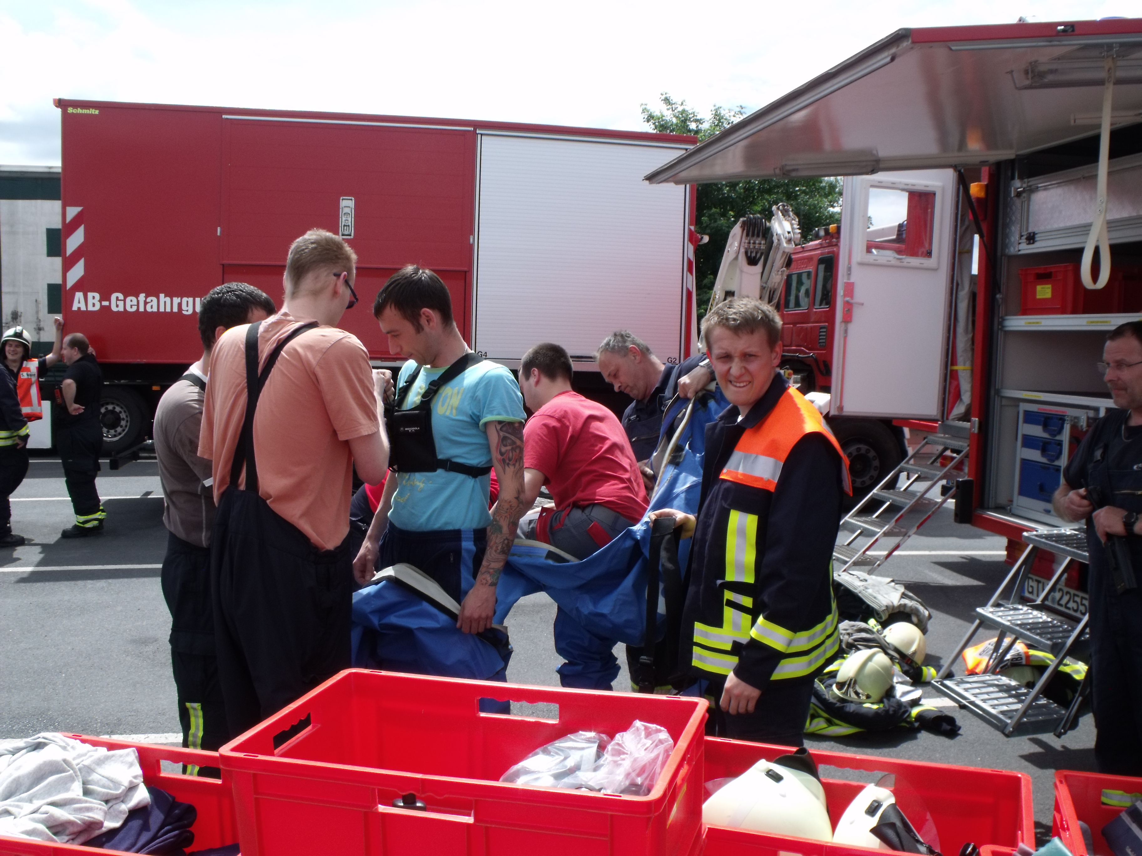 Heute wurde der Gefahrgutzug vom Landkreis Gotha auf den Autohof in Schwabhausen gerufen. Bei einer Ladungskontrolle bemerkten die Beamten der Gothaer Polizei zwei undichte Fässer auf einem Sattelschlepper aus Leuna. Es handelte sich dabei um Zinntetrachlorid. Der Stoff ist ätzend, sauer und anorganisch. Schon bei einer Temperatur von 20°C verdampft die Flüssigkeit rasch und erreicht schnell eine toxische Konzentration in der Luft und kann ein toxisches Lungenödem auslösen. Wie typisch für ein toxisches Lungenödem kann die Symptomatik erst nach einigen Stunden bis drei (!) Tagen auftreten. Ca. 60 Kameraden aus Waltershausen, Gotha-Mitte, BF Gotha, Georgenthal, Emleben, Tambach-Dietharz, Neudietendorf, Ohrdruf, Warza, Gräfentonna, Wechmar, Wahlwinkel, Gräfenhain waren im Einsatz. Zwei Kameraden von Tambach gingen unter schwerem CSA zur Erkundung vor. Zwei Kameraden aus Gotha Mitte haben dann die betroffene Palette geborgen. Und zwei Feuerwehrleute aus Neudietendorf nahmen dann eine Probe.