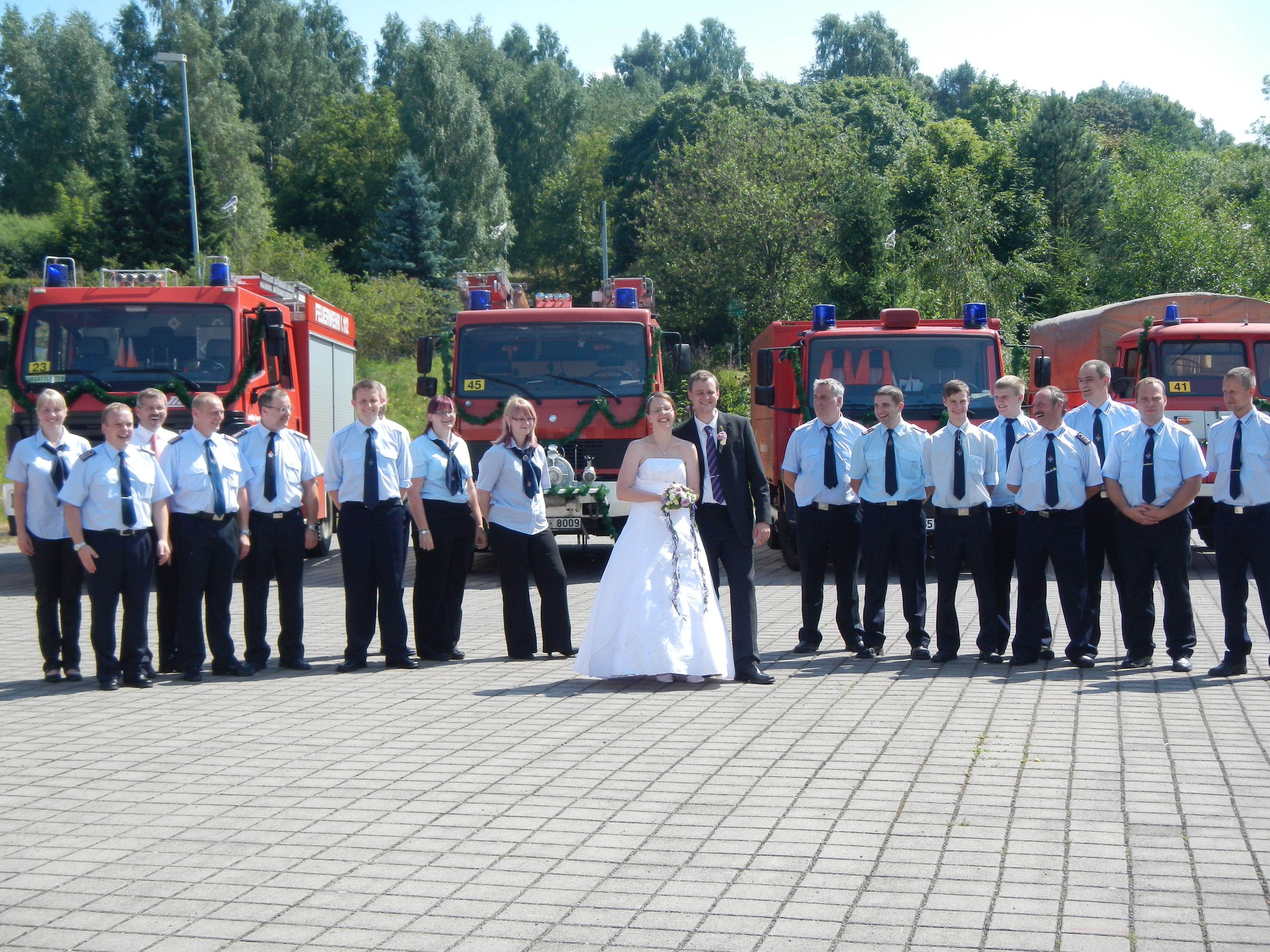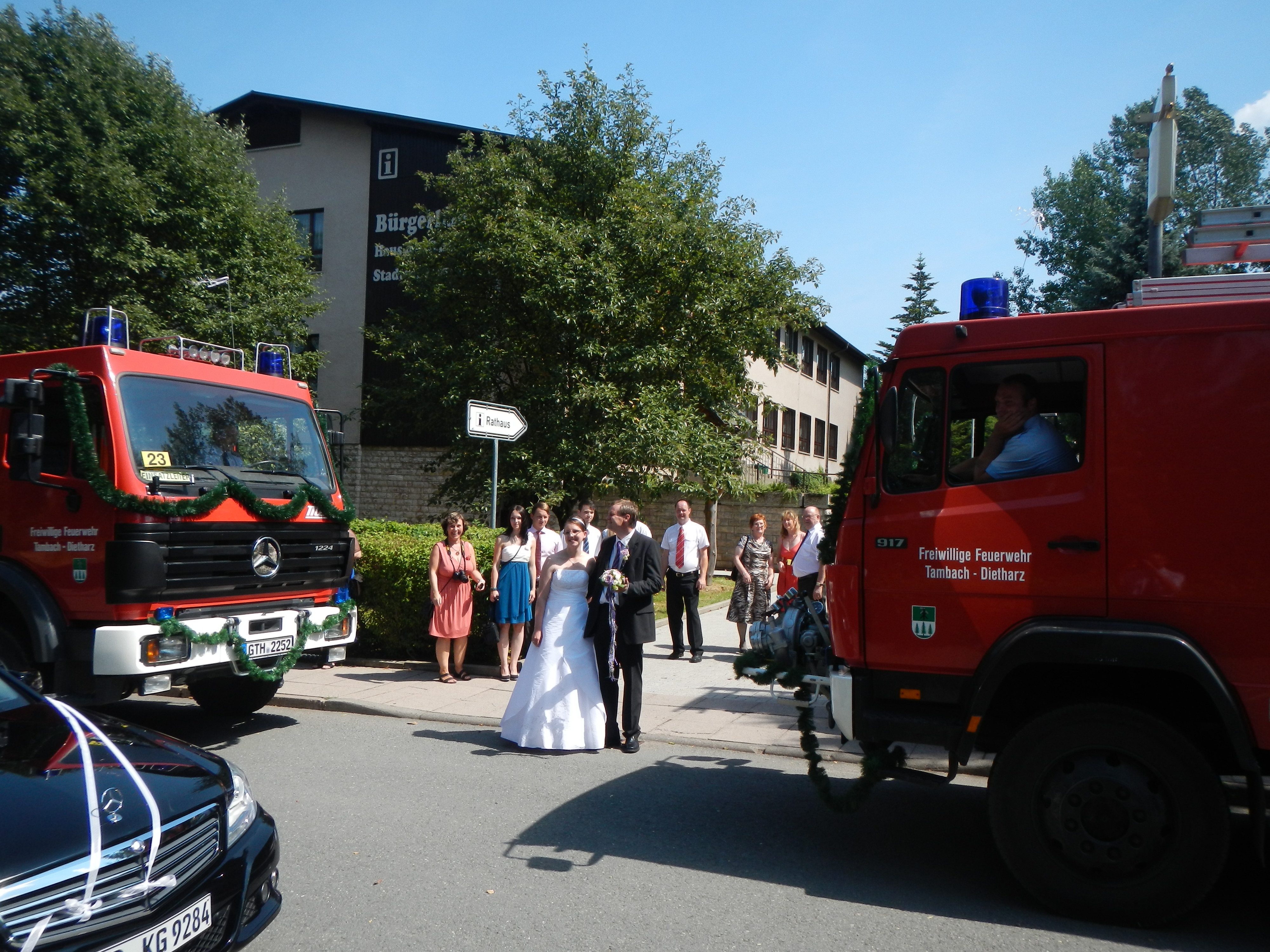 Heute am 27.07.2013 hat unser Kamerad Martin Horn seine Freundin Janine geehelicht. Auf diesem Wege wünschen wir dem Ehepaar nur das Beste. Diese Hochzeit war wohl bisher die heißeste, die in Tambach gefeiert wurde, denn in der Sonne waren es schlappe 53°C.