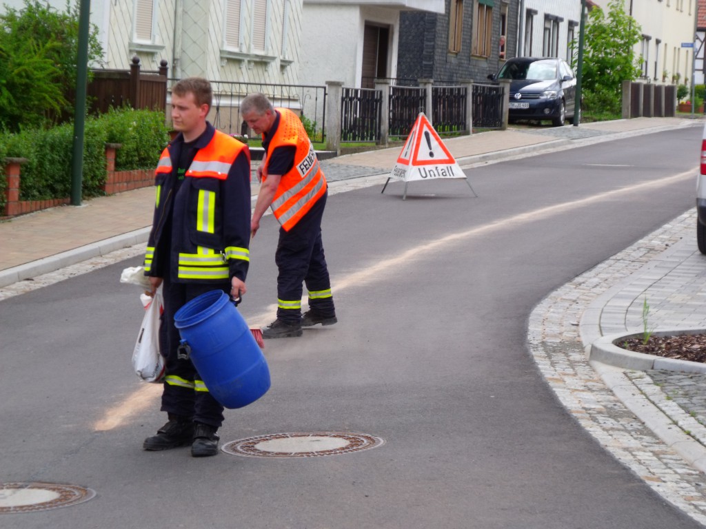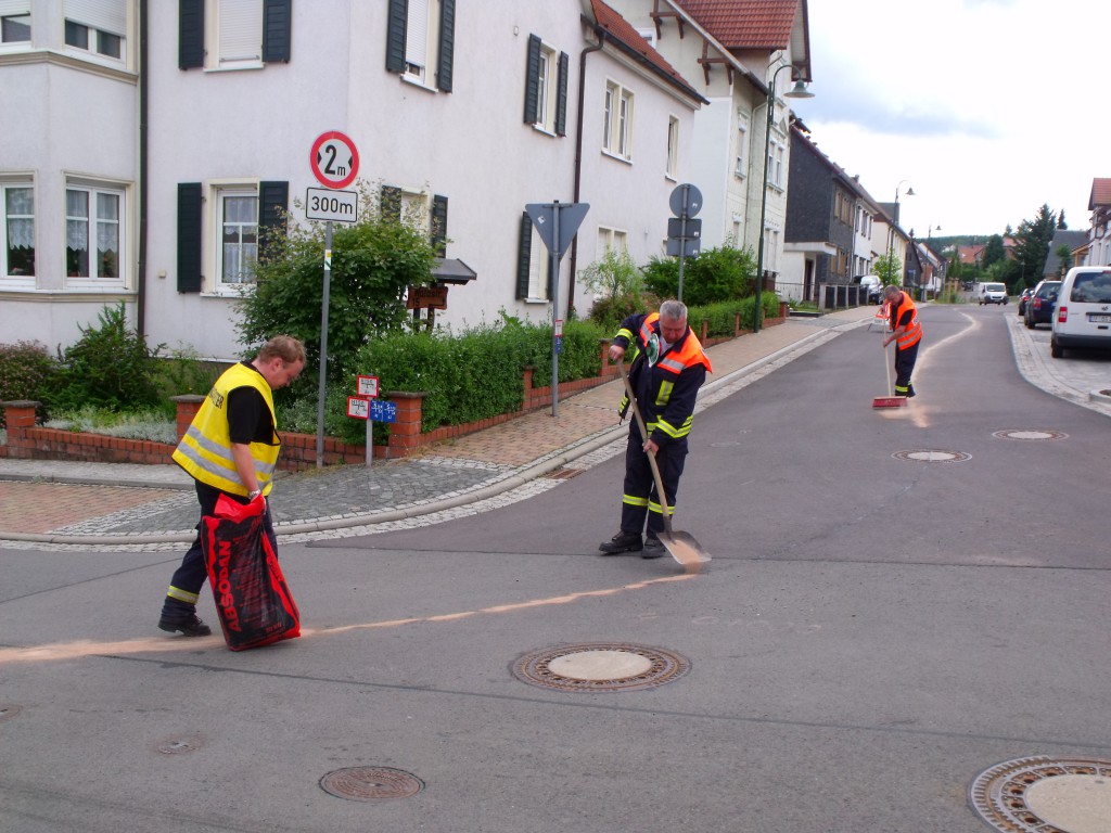 Bergstraße, Schmalkalder Straße, August-Bebelstraße, Waldstraße und ein Paar mehr Straßen waren heute durch eine Ölspur verschmutzt. Mit Hilfe von Ölbindemittel und Muskelkraft wurde der schmierige Film gebunden. Zum Glück haben wir kein Wasser benutzt um die Ölspur mit Bioversal zu entfernen, denn das Wasser brauchten wir wenig später sehr dringend…..