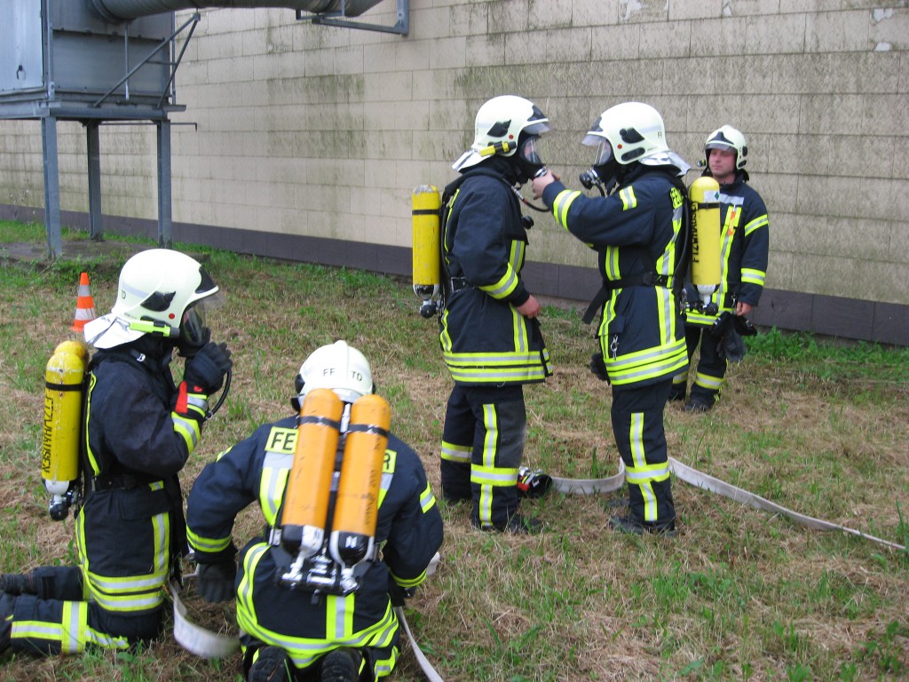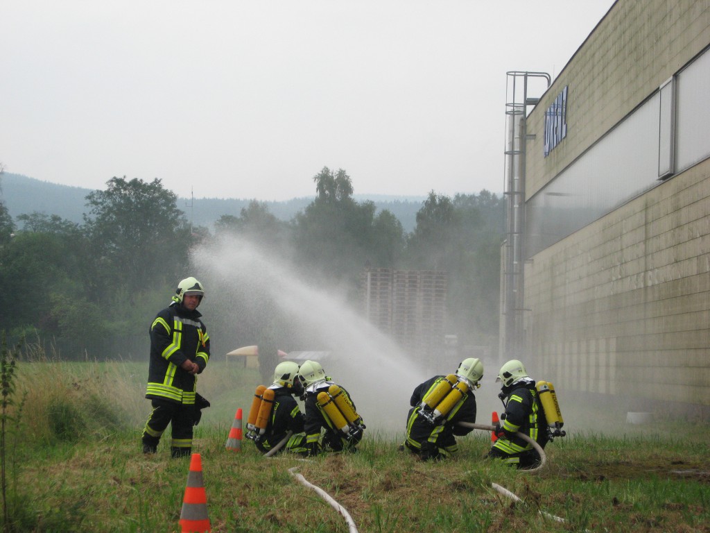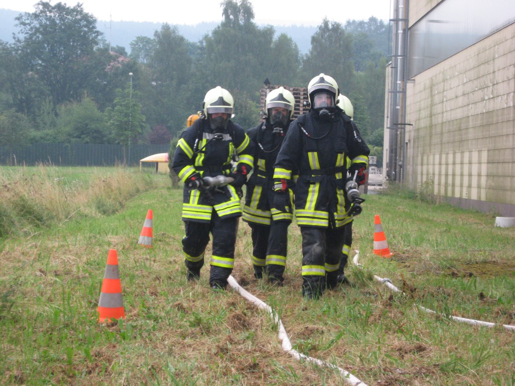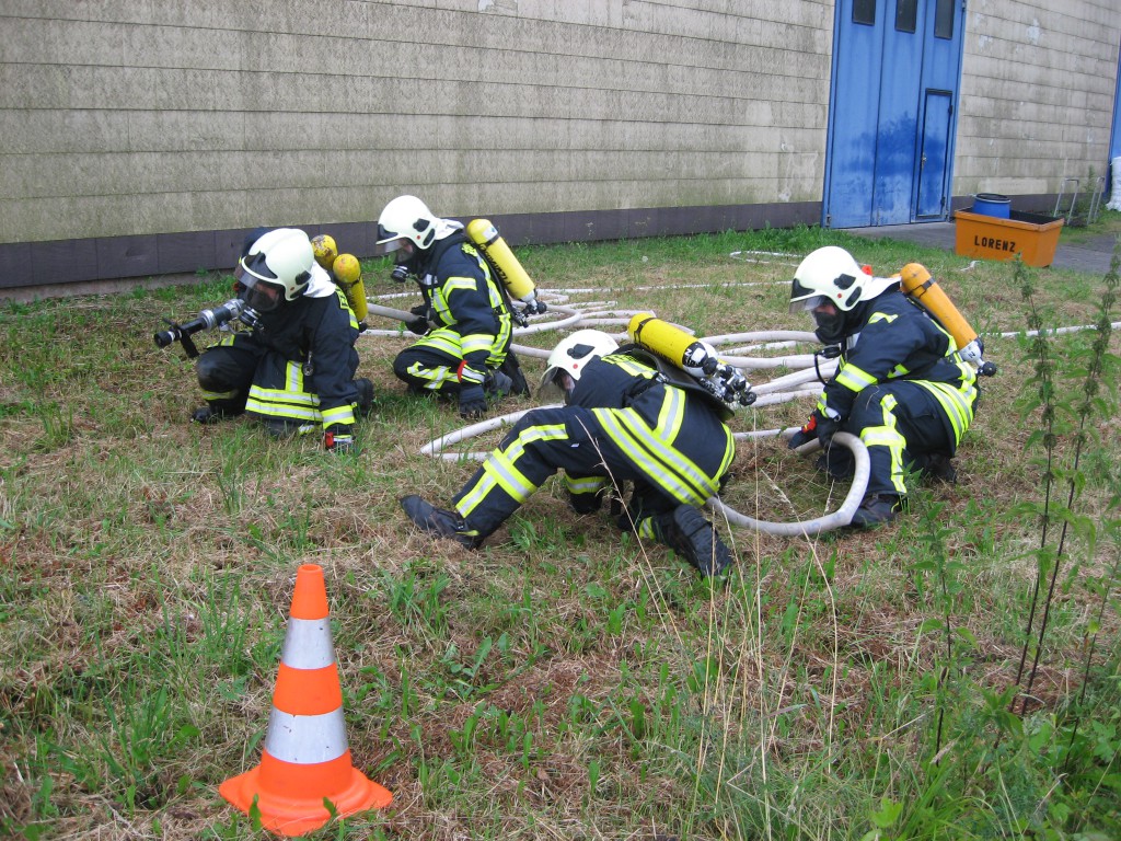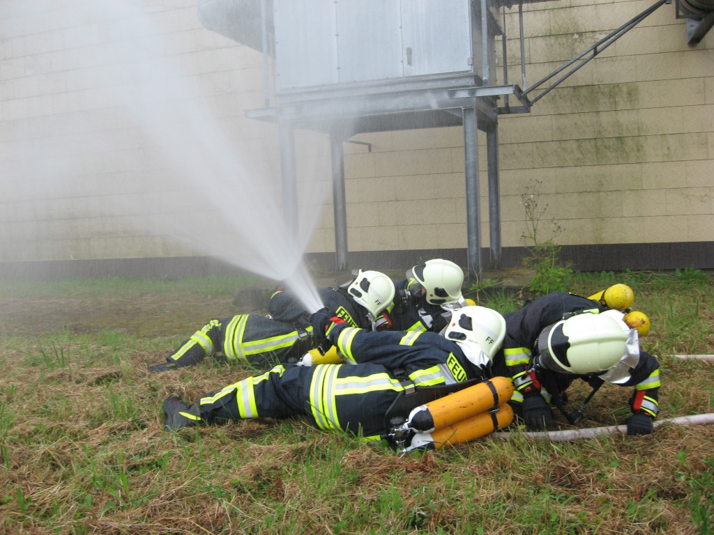 Für den letzten Dienst am 14.07. stand für unsere Kameraden das Hohlstrahlrohrtraining auf dem Plan. Auf dem Gelände der Firma Lorenz wurde durch Kegel eine Strecke abgesperrt. Die ersten Kegel standen für den Hauseingang. Nach einigen Metern kam die Rauchgrenze, wo die Atemschutzgeräte angelegt werden mussten. Dann kam die simulierte Tür. Kurzes Öffnen der Tür und stoßweises Löschen musste ausgeführt werden. Im Kreuzkriechgang mussten wir den gefüllten Schlauch hinter uns herziehen und wenn der simulierte Flashover kam…mussten wir uns nach hinten fallen lassen und den Sprühnebel nach ober richten- „Schutzreflex“. Es war eine lehrreiche Ausbildung, welche uns mal wieder zeigte, wie anstrengend so ein Einsatz sein kann.