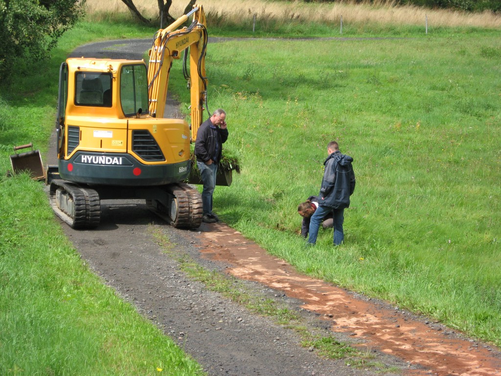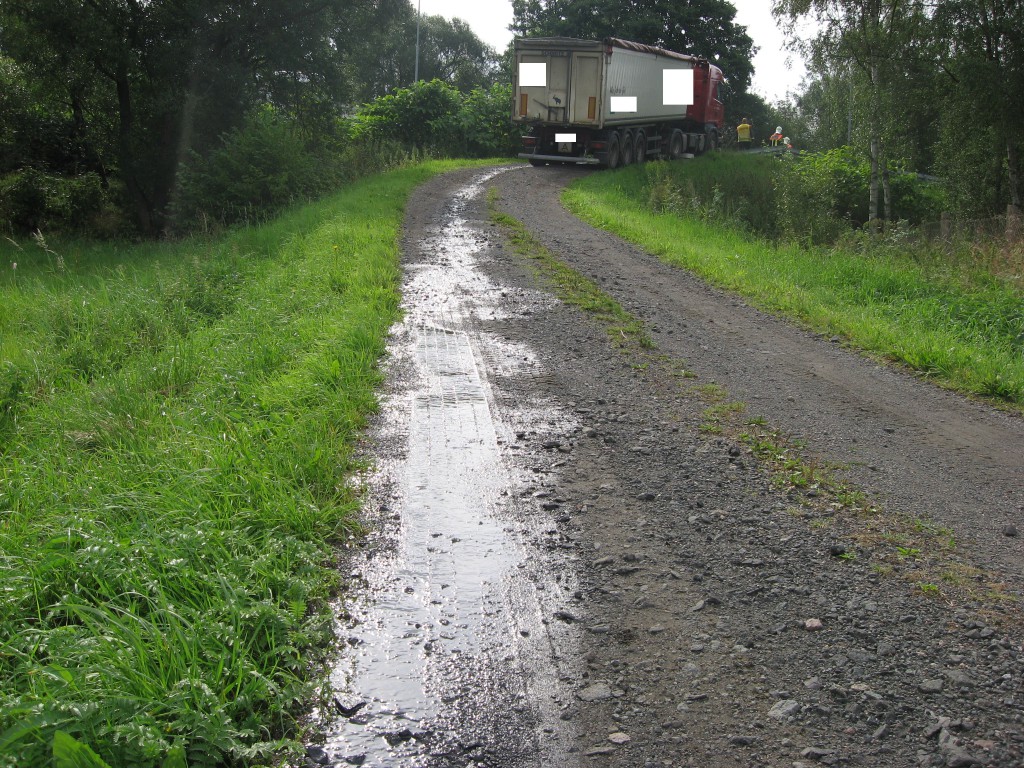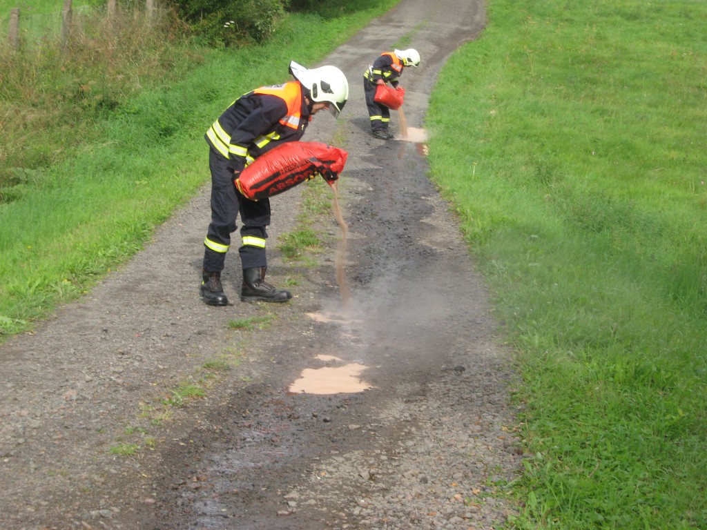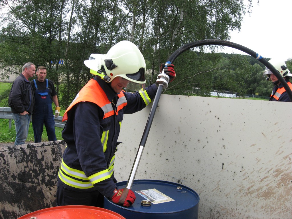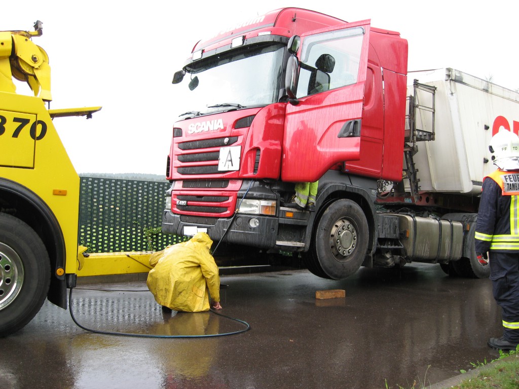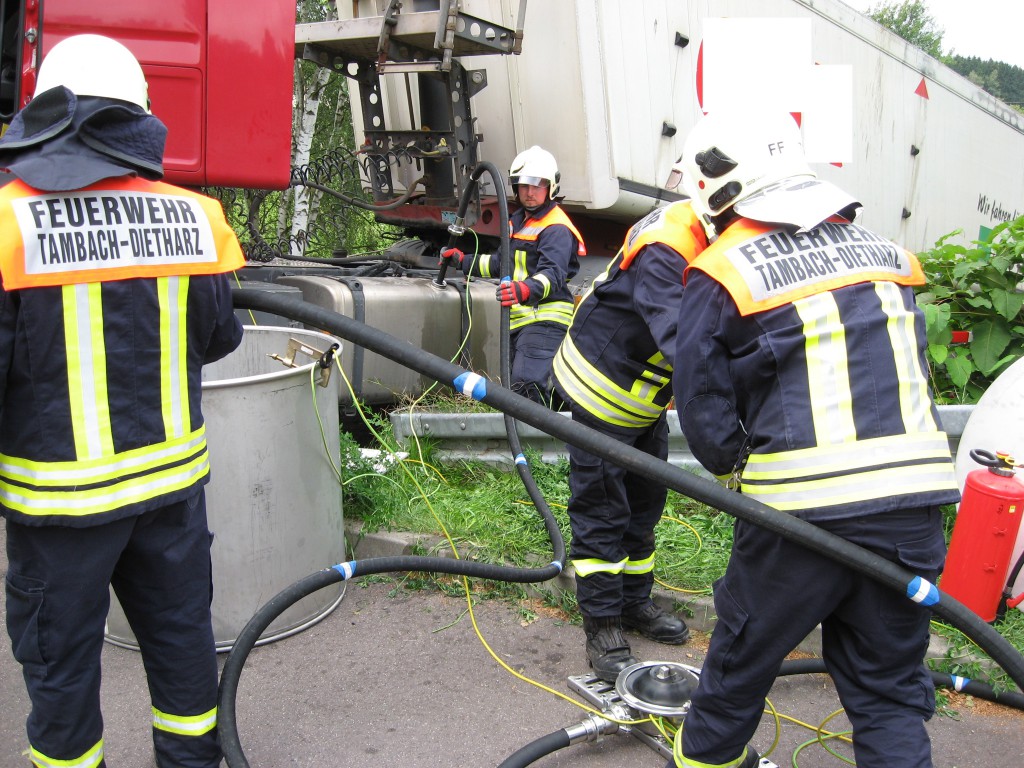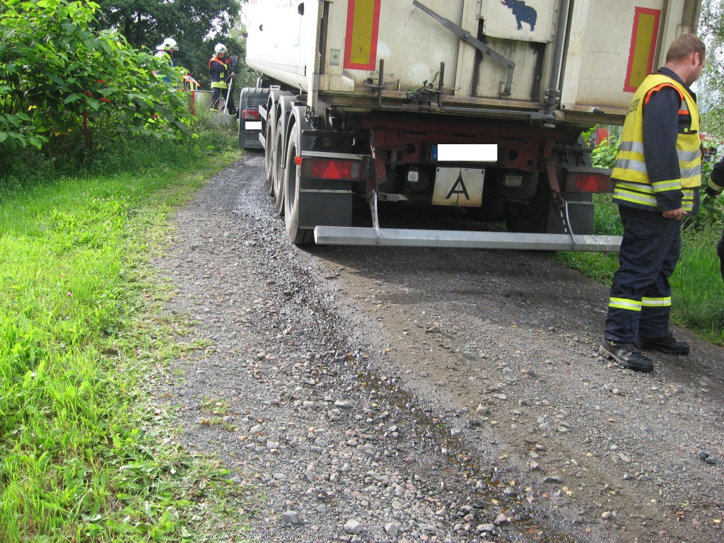 Ein mit über 10 Tonnen beladener LKW mit Sch… Klärschlamm kam von der Kläranlage und beschädigte sich an einer Bordsteinkante seinen Tank. Einige Liter Diesel versickerten auf dem Schotterweg. Wir fingen den Diesel auf und pumpten ihn zusätzlich mit einer Fasspumpe ab. ca. 400 Liter Treibstoff konnten wir retten. Das Erdreich wurde von einer Entsorgungsfirma abgetragen, wie es vom Umweltamt veranlasst wurde.