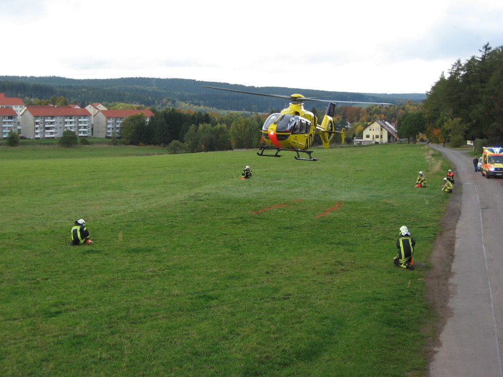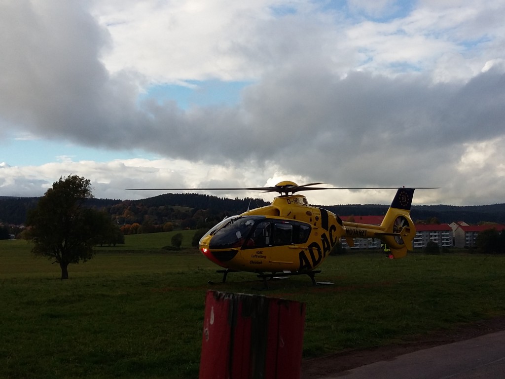 Nach einem ca. 3m tiefen Sturz war ein Arbeiter so schwer verletzt, dass er mit einem Heli ins Krankenhaus geflogen werden musste. Wir übernahmen die Absicherung der Landung und leisteten Tragehilfe… in den Krankenwagen und dann weiter in den Heli.